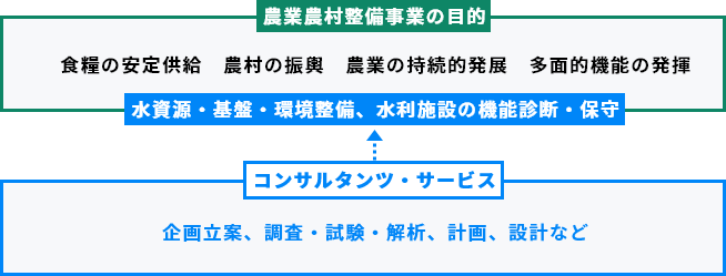 国の施策である「農業・農村整備事業」は、食料の安定供給などを目的として、水を確保するためのダムや堰(せき)及び水路などの建設、営農条件を改善するための基盤整備、農村の環境整備などを行っています。