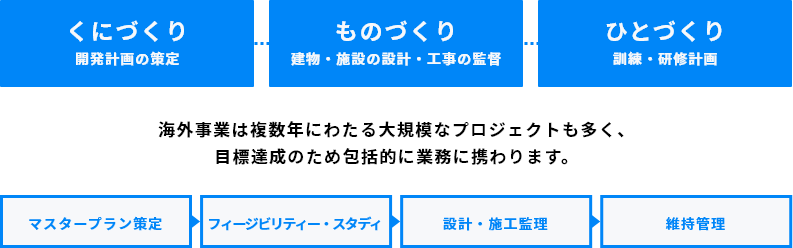 政府開発援助(ODA)事業を中心とした発展途上国の開発援助政策や経済格差対策など、より良い国際環境を構築するため、三祐コンサルタンツは、「クニづくり」「モノづくり」「ヒトづくり」という3本の柱を中心とした開発協力を通じて、発展途上国の良きパートナーとして問題解決に努めています。